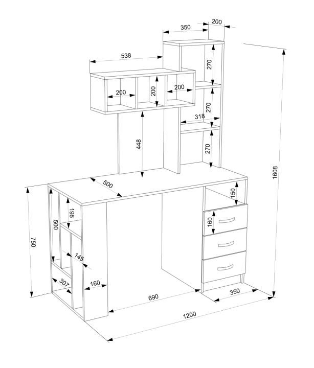 Размеры компьютерного стола: ширина - 1200 мм (120 см); глубина - 500 мм (50 см); высота - 1608 мм (160,8 см).