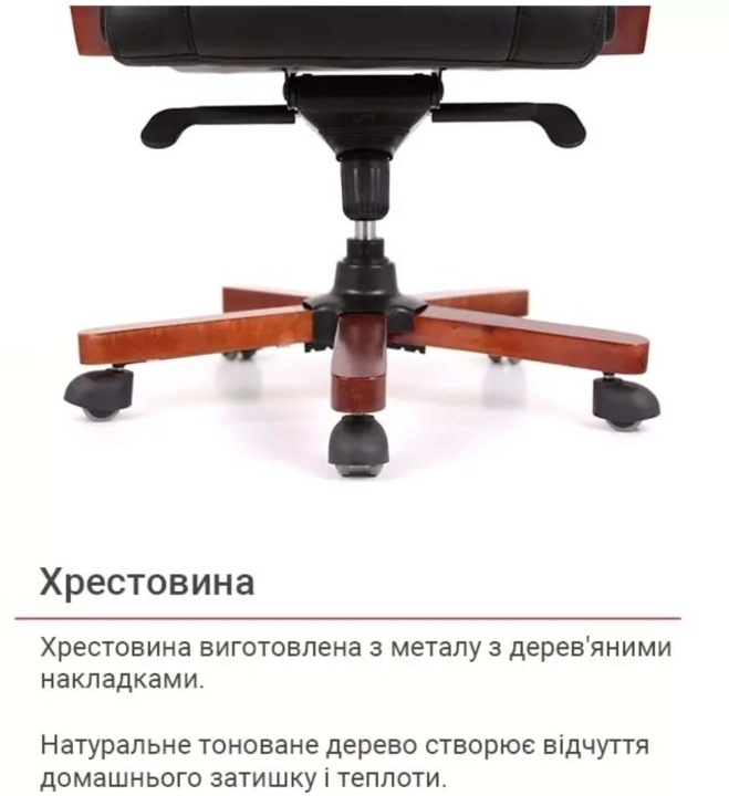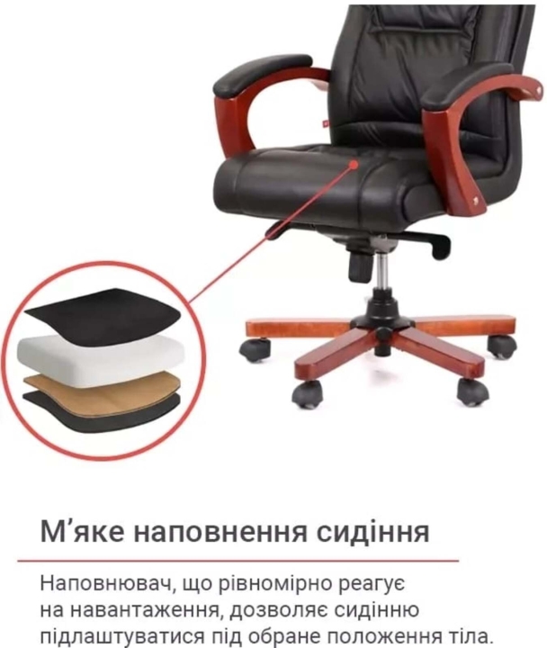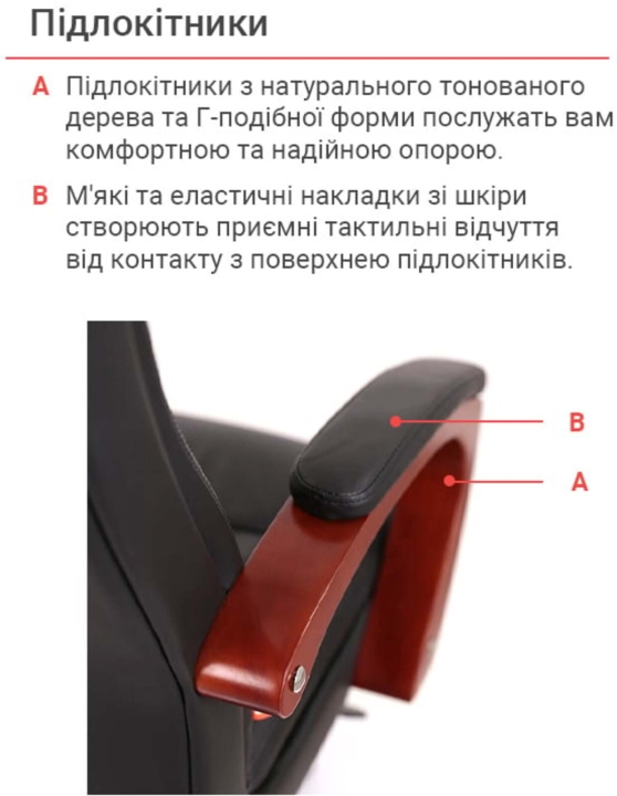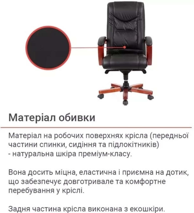 Для пошива чехла на рабочих поверхностях используется натуральная кожа коровы, а именно на передней части спинки, сиденье и подлокотниках.На нерабочих поверхностях - экокожа, а именно искусственный материал на тканевой подкладке на боковых вставках, задней части спинки.Механизмы. Вдобавок комфортному сиденью кресло Артур оснащено механизмом мультиблок, с помощью которого вы сможете полноценно наслаждаться временем, проведенным в этом кресле, включив режим качания повышенной комфортности. Этот механизм также дает возможность выбрать и зафиксировать желаемое положение сиденья со спинкой и изменять его по своему усмотрению. Мультиблок легко настраивается под пользовательский вес с помощью декоративного винта под сиденьем, что позволяет ему отлично выполнять свою работу. Газлифт поможет вам отрегулировать высоту кресла под ваши предпочтения.Подлокотники. Г-образная форма и размер подлокотников подобраны таким образом, чтобы рукам было комфортно на них опираться. Натуральное тонированное дерево создает ощущение домашнего уюта и теплоты. Мягкие накладки защищают руки от контакта с холодной и жесткой поверхностью и дарят дополнительный комфорт. Красота дерева долгие годы будет радовать вас благодаря стойкому лаковому покрытию. Высота подлокотников в нижнем положении подобрана так, что кресло легко заходило под стандартный рабочий стол высотой от 75 см. Это позволяет значительно освободить окружающее пространство, в то время когда кресло не используется по назначению.Крестовина. Крестовина изготовлена из металла с деревянными накладками.