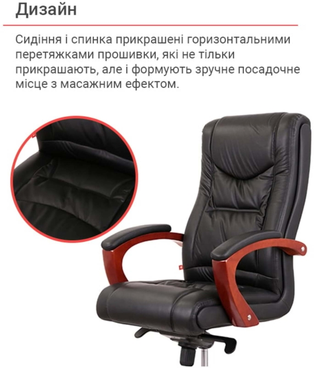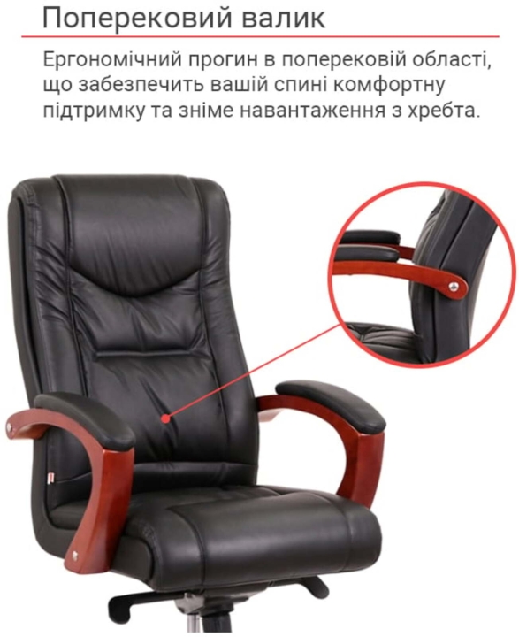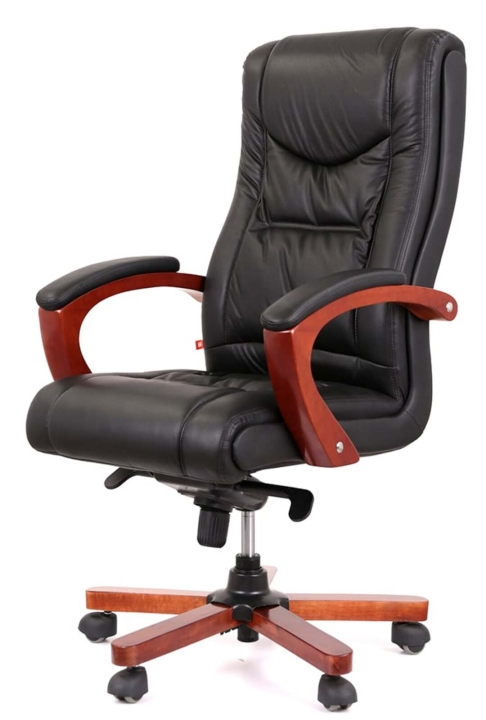 Кресло АКЛАС Артур EX MB Черный (Кожа LC-A black) – сочетание высокого качества и тонкого чувства стиля с функциональными возможностями. Эта солидная и практичная модель станет отличным украшением для Вашего кабинета за счет элегантного дизайна и гармоничного сочетания разных элементов. Такое кресло подчеркнет не только высокий статус своего владельца, но и хороший вкус. Артур – это классика, идеально сочетающаяся с качеством и современными технологиями. Все детали тщательно подобраны и порадуют вас как отдельно, так и единым ансамблем. Такое кресло несомненно украсит ваше рабочее пространство и станет надежным спутником на пути достижения высоких целей во всех ваших делах и начинаниях.Дизайн. Просто, но в то же время изысканно – вот как можно охарактеризовать это кресло. Силуэт достаточно лаконичен, но благодаря удачному сочетанию кожи и дерева он выглядит много. Сидения и спинка украшены горизонтальными перетяжками прошивки, которые не только украшают, но и формируют удобное посадочное место с массирующим эффектом. Деревянные детали красивого оттенка каштана гармонично смотрятся на фоне классического цвета обивки и подчеркивают красоту кресла.Обивка. Приятный на ощупь обивочный материал данной модели из натуральной кожи класса Lux поможет Вам наслаждаться временем проведенным за работой в этом кресле, ведь этот природный материал не нуждается в представлении – прочный, надежный, гипоаллергенный. Данная обивка уже сама по себе является признаком определенного вкуса и статуса. Для большего комфорта поверхность материала перфорирована, что улучшает ее воздухопроницаемость. Этот износостойкий материал и предельно прост в уходе, что обеспечит креслу безупречный внешний вид на долгие годы. Оригинальная просрочка формирует неповторимый внешний силуэт с привлекательными формами, что стало возможным благодаря эластичности обивочного материала.
