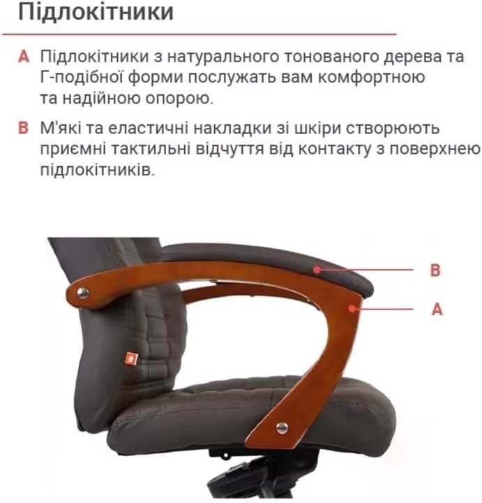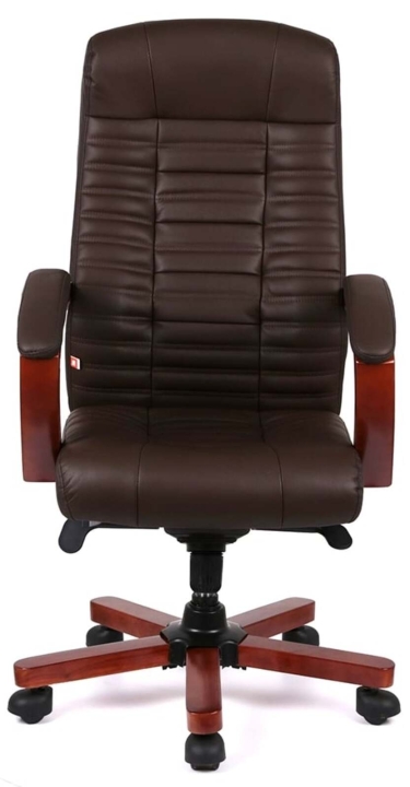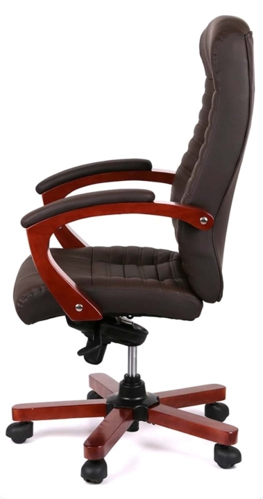 Подлокотники. Престижность данного кресла подчеркивают форменные, широкие подлокотники. Их Г-образный изгиб и размер подобраны так, чтобы рукам было удобно опираться на них. Натуральное тонированное дерево создает ощущение домашнего уюта и теплоты. Мягкие накладки защищают руки от контакта с жесткой поверхностью и дарят дополнительный комфорт.