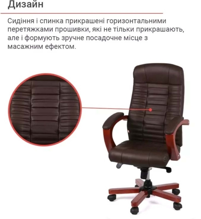 Дизайн. Элегантная модель в классическом стиле – вот как можно описать дизайн этого кресла. Кресло достаточно большое, выглядит внушительно, но без лишней помпезности – ровно на столько, чтобы подчеркнуть респектабельность и хороший вкус своего успешного владельца. Силуэт достаточно лаконичен, но благодаря удачному сочетанию кожи и дерева он смотрится дорого и презентабельно. Сидения и спинка украшены элегантной прошивкой, которая не только украшает, но и формирует удобное посадочное место с массирующим эффектом. Деревянные, тонированные лаком детали подчеркивают полуматовый оттенок натуральной кожи, логически завершая богатый ансамбль.