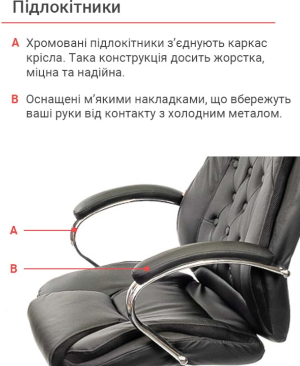 Подлокотники. Подлокотники изготовлены из металлической хромированной трубы. Овальная форма подлокотников в комплекте с мягкими накладками будут служить вашим рукам надежной и комфортной опорой. Удачно подобранные размеры и высота подлокотников позволят удобно разместить руки, когда плечи упираются и не устают во время долгого рабочего дня.