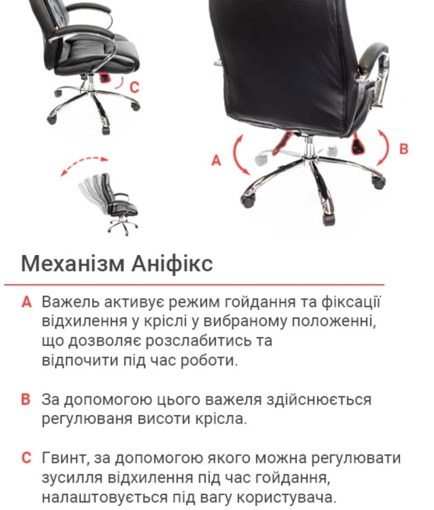 Механизмы. Встроенный механизм качания повышенной комфортности анификс дает возможность устроить себе любимый сеанс релакса, не прерывая важный телефонный звонок или продолжая составлять грандиозные планы покорения бизнес-олимпа, а после заняться текущими делами, зафиксировав кресло в удобном положении.Надежный газомасляный амортизатор позволяет изменить высоту кресла с учетом вашего роста.