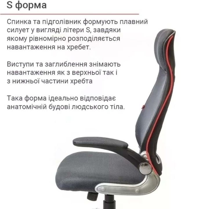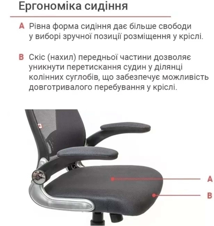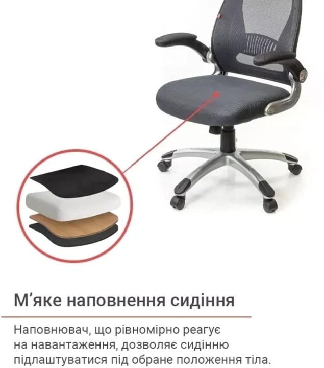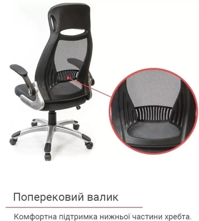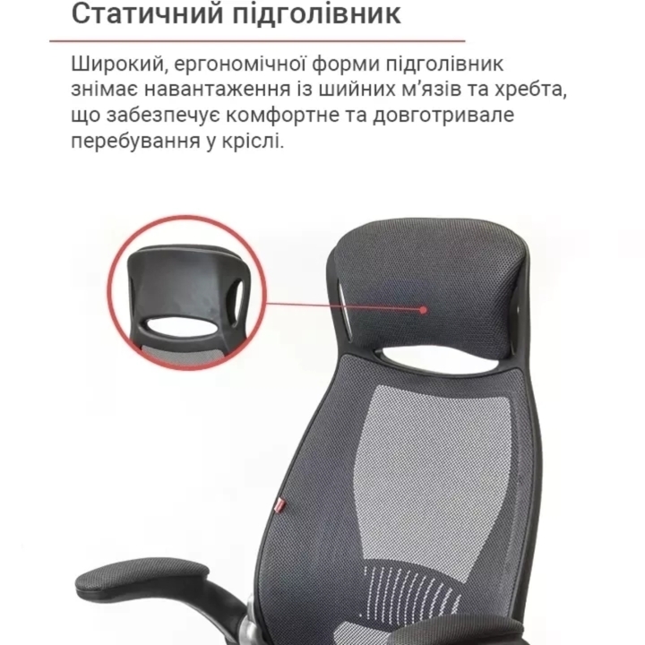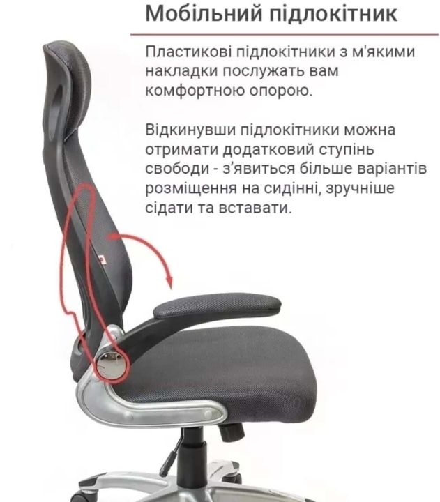 Підлокітники. У даній моделі стильні масивні підлокітники оригінальної форми з чорного пластику. Вони мають горизонтальну робочу поверхню, що дозволяє зручно розмістити руки і зняти зайве навантаження з плечових суглобів. М'які накладки послужать вам комфортної опорою. Гвинтові кріплення підлокітників дають можливість підняти їх вертикально, і присунути крісло впритул до столу, коли крісло не використовується.