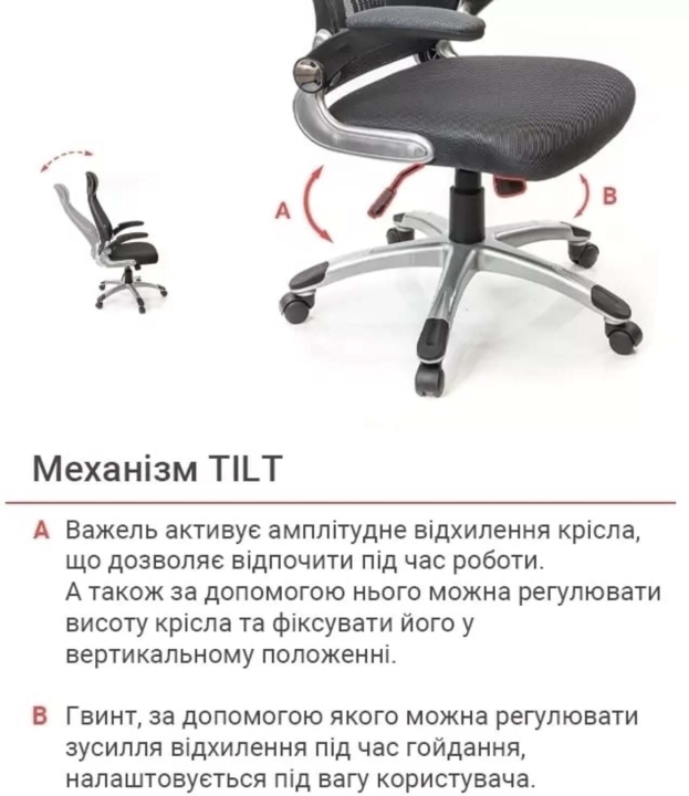 Механізми. Механізм гойдання Tilt дає можливість переключитися від роботи в режим приємного релаксу, не залишаючи улюблене крісло. Даний механізм має індивідуальну настройку під вагу користувача. Повернути в робоче положення крісло можна одним рухом руки. Газліфт дозволить відрегулювати висоту крісла так, щоб ви влаштувалися в ньому з максимальним комфортом відповідно до вашого зросту.