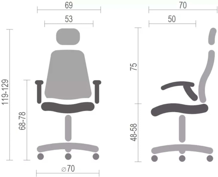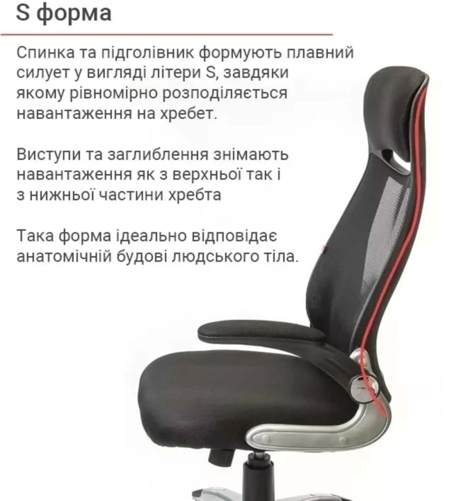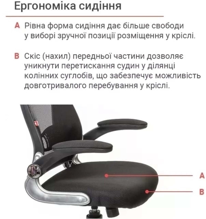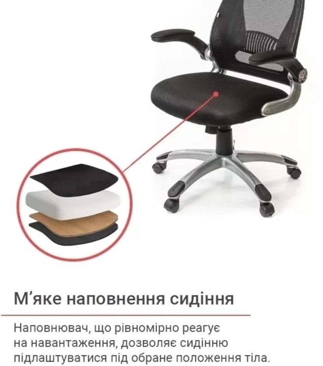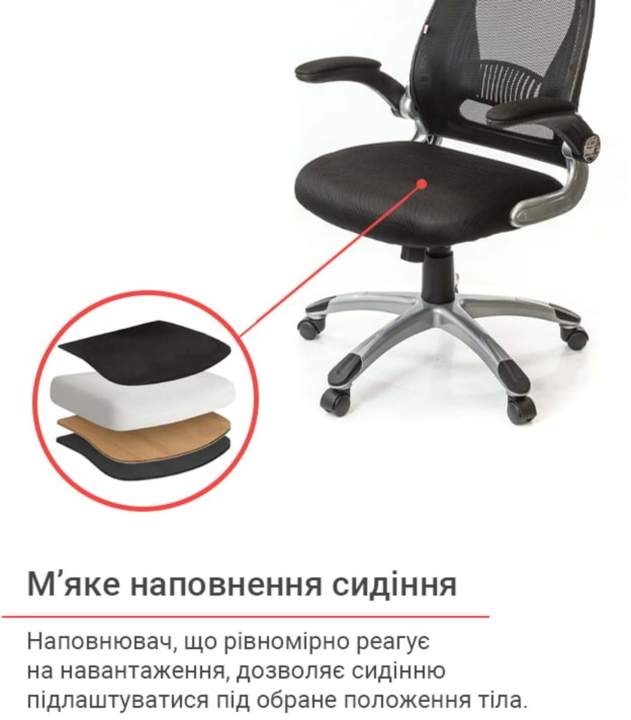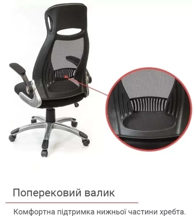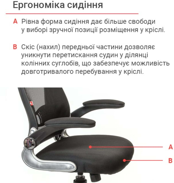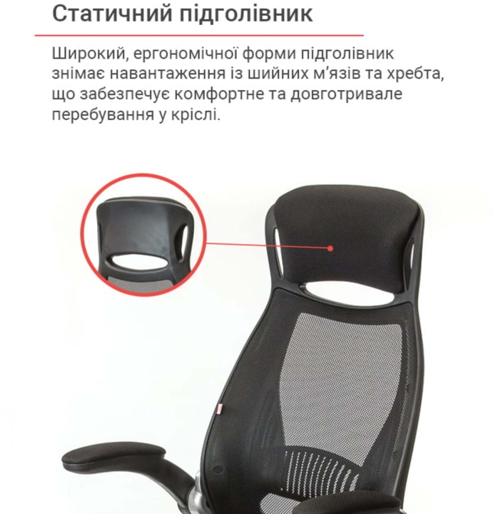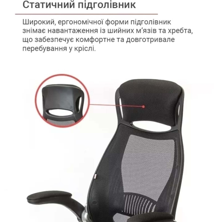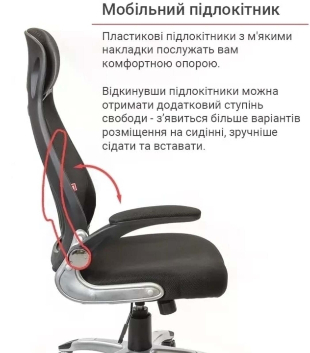 Подлокотники. У данной модели стильные массивные подлокотники оригинальной формы из черного пластика. Они имеют горизонтальную рабочую поверхность, что позволяет удобно разместить руки и снять излишнюю нагрузку с плечевых суставов. Мягкие накладки послужат вам удобной опорой. Винтовые крепления подлокотников позволяют поднять их вертикально, и придвинуть кресло вплотную к столу, когда кресло не используется.