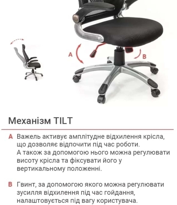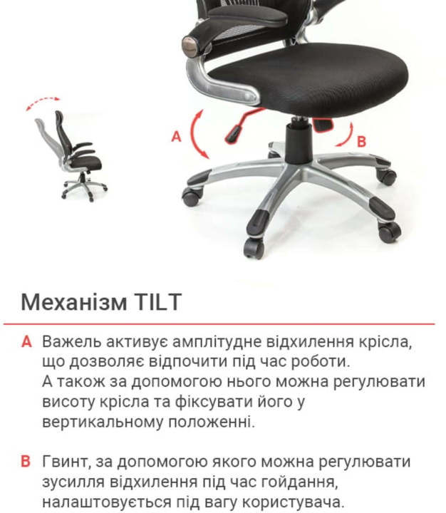 Механизмы. Механизм качания Tilt позволяет переключиться от работы в режим приятного релакса, не оставляя любимое кресло. Данный механизм имеет индивидуальную настройку под пользовательский вес. Повернуть в рабочее положение кресло можно одним движением руки. Газлифт позволит отрегулировать высоту кресла так, чтобы вы устроились в нем с максимальным комфортом в соответствии с вашим ростом.