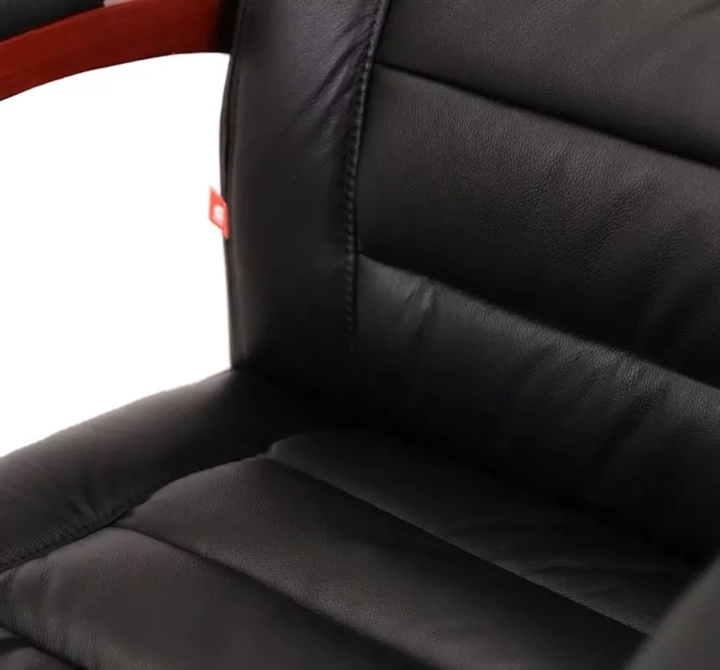 Дизайн. Просто, але в той же час вишукано - ось як можна охарактеризувати це крісло. Силует досить лаконічний, але завдяки вдалому поєднанню шкіри та дерева, він виглядає багато. Сидіння та спинка прикрашені горизонтальними перетяжками прошивки, які не тільки прикрашають, але і формують зручне посадочне місце з масажним ефектом. Дерев'яні деталі красивого каштанового відтінку гармонійно виглядають на тлі класичного кольору оббивки і підкреслюють красу крісла.