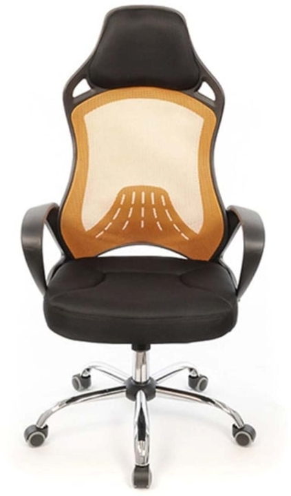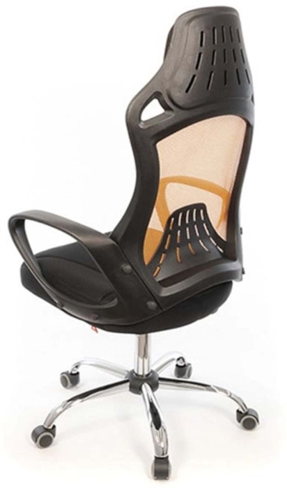 Крісло АКЛАС Дорос CH Tilt (Чорний/Помаранчевий) - стильне офісне крісло, що поєднує в собі футуристичний дизайн і сучасні технології. Завдяки таким своїм якостям, як ергономічність, повітропроникність і практичність, Дорос стає незамінним для людини, яка довгі години проводить на своєму робочому місці. Одна з особливостей моделі - особливе поєднання оббивок спинки з нейлонової сітки і стільникової тканини. Крісло виглядає стильно. Оригінальний каркас спинки, в основі якого біла пластикова рама, має ергономічну форму з бічною підтримкою. Це допомагає створити приємний підтримуючий ефект спини з боків і в області попереку. Таке крісло відмінно доповнить інтер'єр сучасного офісу, затишне домашнє робоче місце чи кімнату підлітка. Дизайн. Дизайн крісла - урбаністичний, який відповідає останнім віянням моди. Напівпрозора спинка на пластиковому каркасі - це основний елемент дизайну даної моделі. Оббивка. В якості основної оббивки спинки в кріслі використана нейлонова сітка, яка надає кріслу легкість, а в сидінні використана стільникова тканина. Обидва ці матеріалу міцні, знососстійкі, і в той же час "дихаючі" та еластичні. Вони прекрасно відводять вологу в спекотну погоду і відмінно тримають форму, а це просто незамінні якості для матеріалу офісного крісла, яке повинне витримувати великі навантаження в повсякденній експлуатації. Механізми. Вбудований механізм Tilt з індивідуальними налаштуваннями під вагу користувача дає можливість, похитуючись, як в кріслі-гойдалці, відволіктися від роботи і відпочити, не покидаючи улюблене крісло, а газліфт дає можливості змінити висоту крісла з урахуванням вашого зросту.  Налаштувати гойдання під вагу користувача ви зможете самостійно, використовуючи для цього декоративний гвинт під сидінням. Під більшу вагу пружину потрібно затиснути, а під меншу - відповідно, послабити. Підлокітники. У даній моделі стильні масивні підлокітники оригінальної форми з чорного пластику. Підлокітники мають скошену вперед робочу поверхню, що дозволяє зручно розмістити руки і зняти зайве навантаження з плечових суглобів. Підлокітники кріпляться і до сидіння, і до спинки, тим самим збільшуючи міцність каркасу. Хрестовина. Хрестовина виготовлена з хромованного металлу.