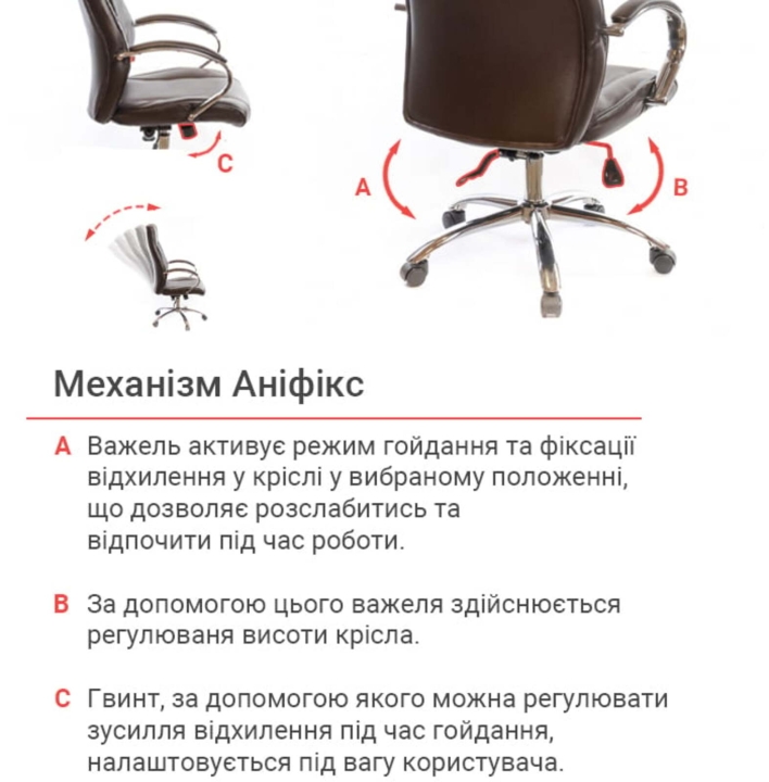 Механизмы. Кресло оснащено механизмом качания Anyfix с фиксацией в рабочем положении, который поможет вам разнообразить рабочее время минутами приятного отдыха. Находясь в любимом кресле, вы сможете расслабиться, не прерывая важный телефонный звонок или продолжая составлять важный отчет. С помощью газлифта можно настраивать высоту кресла под конкретные потребности пользователя. Благодаря декоративной ручке под сиденьем такой механизм легко настраивается под вес пользователя, что позволяет ему работать исключительно безопасно и правильно.
