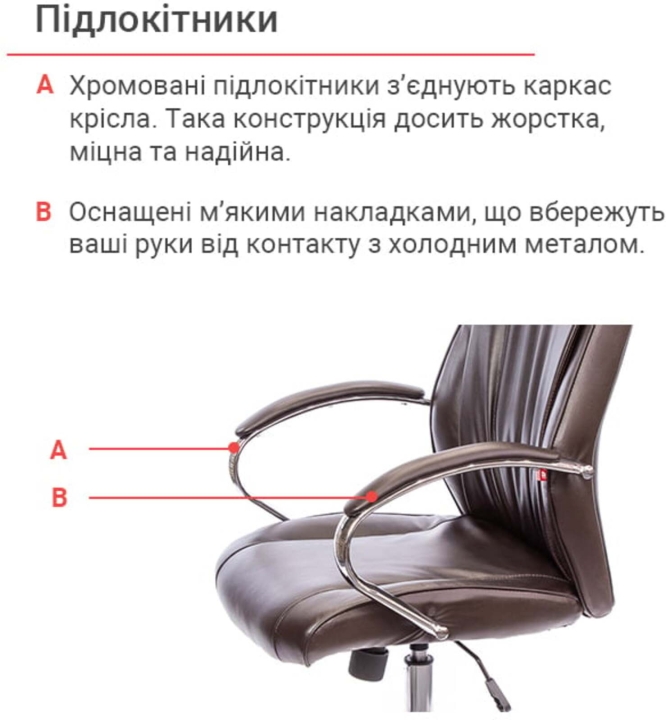 Подлокотники. Элегантный изгиб металлических подлокотников данной модели порадует вас своей эргономичной формой и прочностью, а мягкие накладки не только прекрасно дополняют внешнюю красоту кресла, но и подарят вашим рукам ощущение легкости и максимального комфорта.