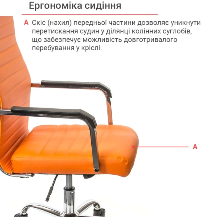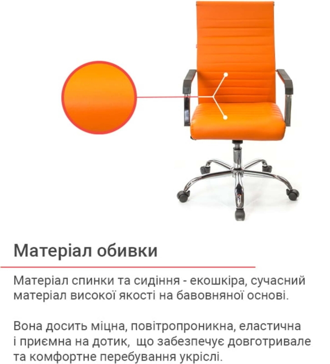 Оббивка. Оббивка у цього крісла - це екошкіра, сучасний матеріал високої якості на бавовняної основі. Вона досить міцна, повітропроникна, еластична і приємна на дотик. За своїми якостями екошкіра практично не поступається натуральній шкірі і має при цьому привабливу ціну. Цей матеріал невибагливий в догляді і відмінно справляється з інтенсивним навантаженням в умовах шаленого ритму сучасного офісного життя.