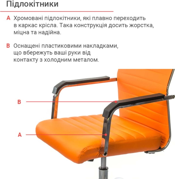 Підлокітники. У даній моделі оригінальні підлокітники з металу, які кріпляться до основної рами збоку болтовими з'єднаннями. Для більшої зручності підлокітники оснащені накладками з чорного пластику, які вбережуть ваші руки від контакту з холодним металом. Висота підлокітників підібрана таким чином, щоб в нижньому положенні сидіння крісло можна було засунути під робочий стіл і звільнити простір біля нього.
