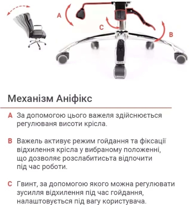 Механизмы. Встроенный механизм качания повышенной комфортности анификс даёт возможность устроить для себя любимого сеанс релакса, не прерывая важный телефонный звонок или продолжая составлять грандиозные планы покорения бизнес-олимпа. А после заняться текущими делами, зафиксировав кресло в удобном положении. Надёжный газо-масляный амортизатор позволяет изменить высоту кресла с учётом вашего роста.