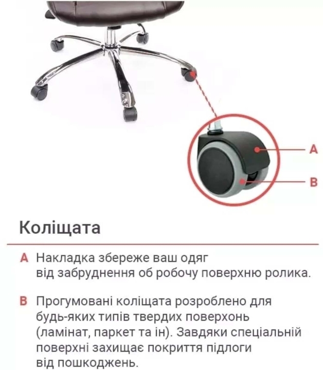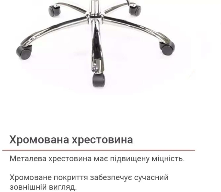 Крестовина. Крестовина у данного кресла из прочного хромированного металла. Благодаря этому ему обеспечена надёжность и устойчивость. При этом оно легко передвигается с помощью роликов. Хромированное покрытие очень стойкое, оно отлично защищает поверхность от мелких царапин и повреждений. Такая крестовина со временем не потеряет свой первоначальный внешний вид и будет долго радовать вас своим холодным блеском. Универсальные прорезиненные ролики, по-умолчанию установленные в кресле, подойдут для любого типа напольного покрытия. Также для данной модели подойдут ролики с хромированными накладками в стилистике кресла.