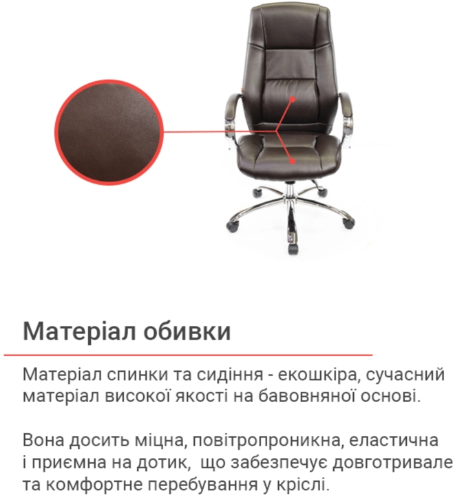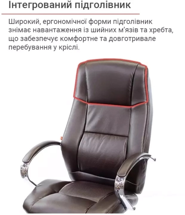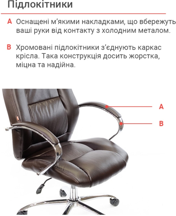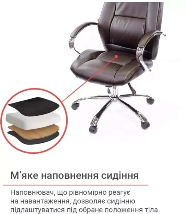 Крісло АКЛАС Оран CH ANF (PU Темно-коричневий) - стильна модель, яка ідеально підходить для кабінету керівника, оформленого у сучасному стилі. За рахунок елегантного дизайну та гармонійного поєднання різних елементів стане чудовим помічником та родзинкою інтер'єру. Оран – це крісло, в якому гармонійно поєднується класичний дизайн, якісні матеріали та сучасні механізми. У ньому ви зможете комфортно працювати, не відчуваючи втоми від багатогодинного сидіння. Завдяки правильно сформованому рельєфу його сміливо можна віднести до категорії ергономічних крісел. М'який наповнювач формує дуже м'яку посадку, що обволікає.Дизайн. Елегантна класика – ось як можна охарактеризувати це крісло. Силует досить стриманий, але завдяки вдалому поєднанню ліній прошивки, шкіри та хромованого металу модель виглядає розкішно та затишно. Сидіння та спинка прикрашені перетяжками прошивки, які разом із товстим шаром наповнювача формують зручне посадкове місце. Блискучі металеві деталі гармонійно обрамляють оббивку і підкреслюють красу крісла. Світла екокожа відмінно доповнить інтер'єр жіночого кабінету або кабінету зі світлим або чорним деревом.Оббивка. Як і належить солідному статусу моделі, Оран виготовлена з якісного екошкіри. Цей матеріал практично не поступається своїми якостями натуральній шкірі, а ціна - це його основна перевага. Він має натуральну основу і відмінно зарекомендував себе за роки використання в офісі. Екошкіра міцна, еластична та проста у догляді.Механізми. Це крісло оснащене механізмом аніфікс.Це популярний механізм з можливістю фіксації в будь-якому зручному положенні, який допоможе вам урізноманітнити робочий час приємним сеансом відпочинку, навіть не перериваючи важливий телефонний дзвінок або продовжуючи складати важливий звіт. Механізм досить просто відрегулювати під певну вагу користувача за допомогою циліндричної ручки під сидінням. Газліфт допоможе встановити оптимальну для Вашого зростання висоту сидіння.Підлокітники. Елегантний дугоподібний вигин металевих підлокітників, доповнений м'якими накладками, не тільки чудово доповнює зовнішню красу крісла, але й убереже ваші руки від контакту з холодним металом та подарує їм почуття максимального комфорту. Висота підлокітників підібрана таким чином, щоб у нижньому положенні сидіння крісло можна присунути впритул до столу.Хрестовина. Хрестовина у даного крісла із міцного хромованого металу. Завдяки цьому йому забезпечено надійність та стійкість. При цьому він легко пересувається за допомогою роликів. Хромоване покриття дуже стійке, воно відмінно захищає поверхню від дрібних подряпин та пошкоджень. Така хрестовина з часом не втратить свій первинний зовнішній вигляд і довго радуватиме вас своїм холодним блиском. Універсальні прогумовані ролики, які за замовчуванням встановлені в кріслі, підійдуть для будь-якого типу покриття для підлоги. Також для цієї моделі підійдуть ролики з хромованими накладками у стилістиці крісла.Особливості. Спинка крісла має правильний вигин у ділянці нирок, завдяки чому знімається навантаження з хребта і ви будете продуктивно і комфортно працювати, абсолютно не відчуваючи втоми навіть наприкінці робочого дня. М'які валики формують зручну бічну підтримку.