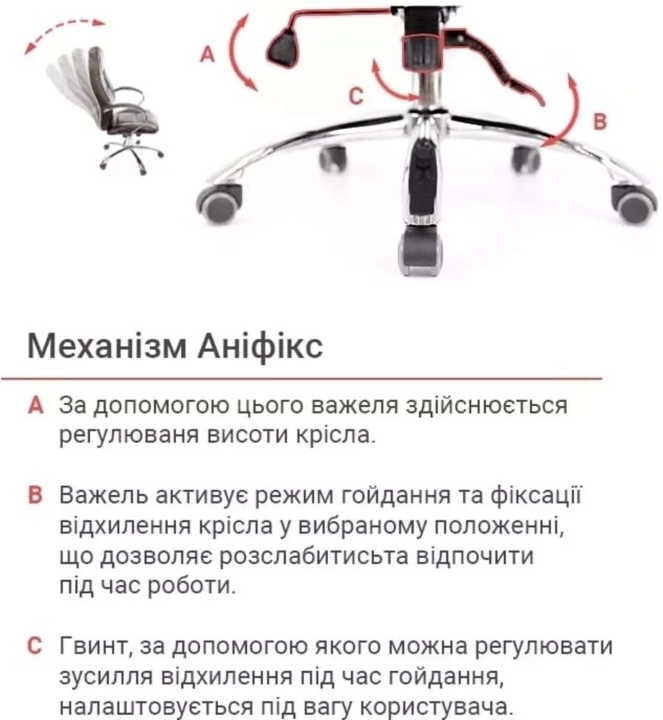 Механизмы. Данное кресло оснащено механизмом анификс. Это популярный механизм с возможностью фиксации в любом удобном положении, который поможет вам разнообразить рабочее время сеансом приятного отдыха, даже не прерывая важный телефонный звонок или продолжая составлять важный отчёт. Механизм достаточно просто отрегулировать под конкретный вес пользователя с помощью цилиндрической ручки под сидением. Газлифт поможет установить оптимальную для Вашего роста высоту сидения.