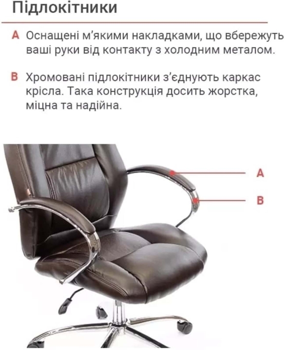Подлокотники. Элегантный дугообразный изгиб металлических подлокотников, дополненный мягкими накладками, не только прекрасно дополняют внешнюю красоту кресла, но и уберегут ваши руки от контакта с холодным металлом и подарят им чувство максимального комфорта. Высота подлокотников подобрана таким образом, чтобы в нижнем положении сидения кресло можно придвинуть вплотную к столу.