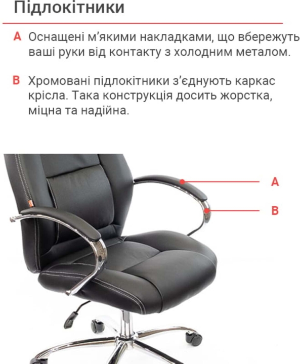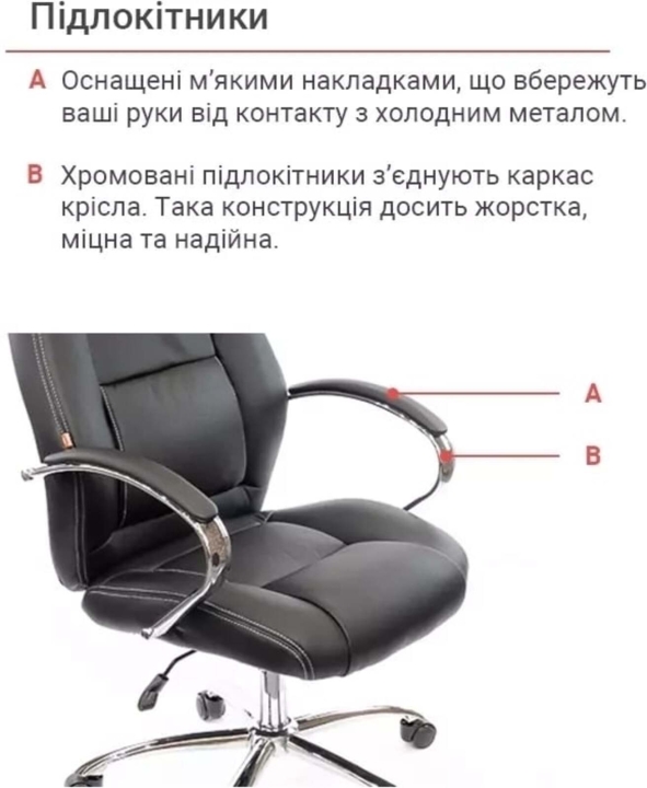 Подлокотники. Элегантный дугообразный изгиб металлических подлокотников, дополненный мягкими накладками, не только прекрасно дополняют внешнюю красоту кресла, но и уберегут ваши руки от контакта с холодным металлом и подарят им чувство максимального комфорта. Высота подлокотников подобрана таким образом, чтобы в нижнем положении сидения кресло можно придвинуть вплотную к столу.