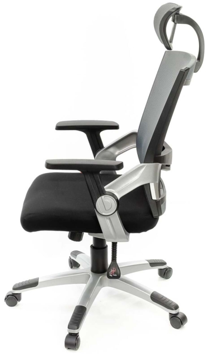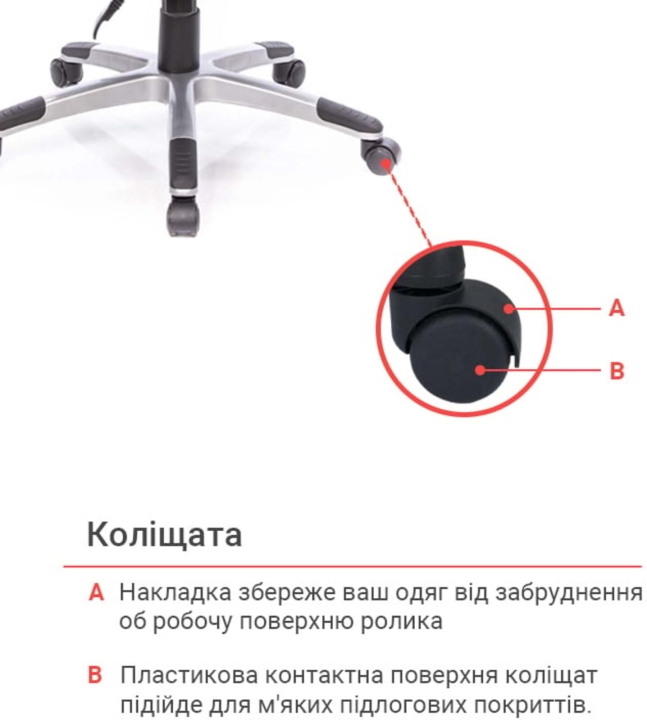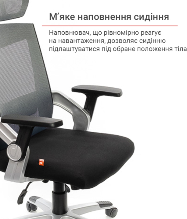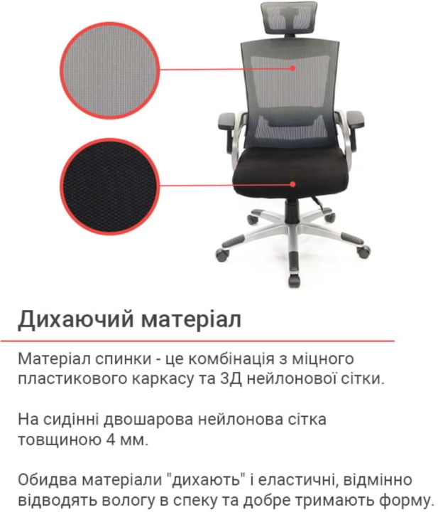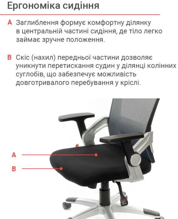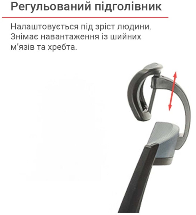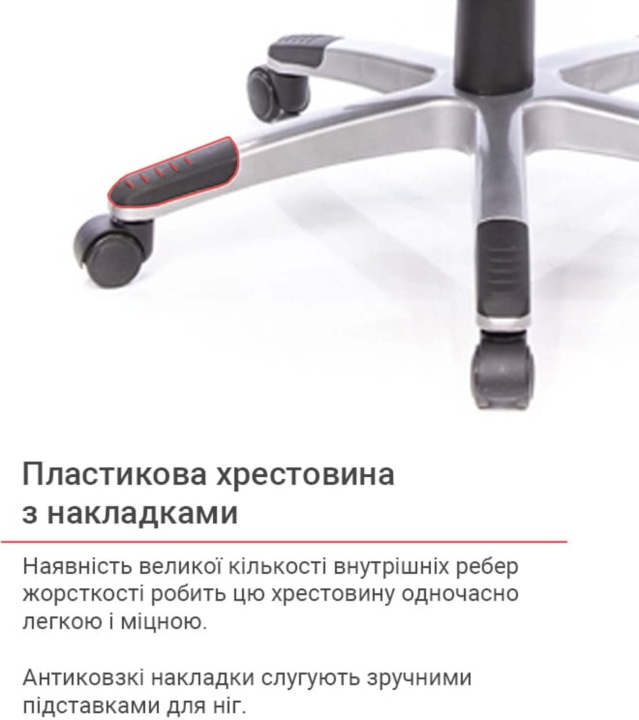 Підлокітники. Пластикові підлокітники у даній моделі - ексклюзивні. Вони складаються з 2 частин різного кольору. Рухома частина Т-подібної форми з чорного пластику має оригінальний дизайн кріплення і може змінювати кут нахилу. Робоча площина, на яку спираються руки, досить велика і має злегка шорстку текстуровану поверхню для того, щоб руки не зісковзували під час роботи.