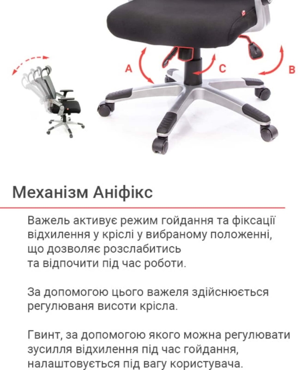 Механізми. Вбудований механізм гойдання підвищеної комфортності Аніфікс дає можливість влаштувати сеанс релаксу, не перериваючи важливий телефонний дзвінок або продовжуючи складати грандіозні плани підкорення бізнес-олімпу, а після - зайнятися поточними справами, зафіксувавши крісло в зручному положенні. Надійний газліфт дає можливість змінити висоту крісла з урахуванням вашого зросту.