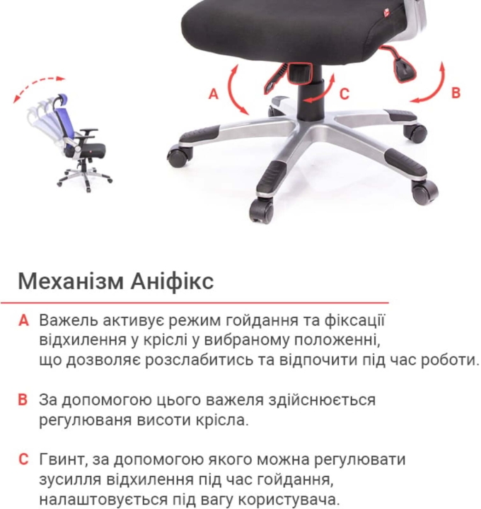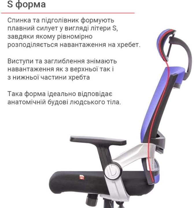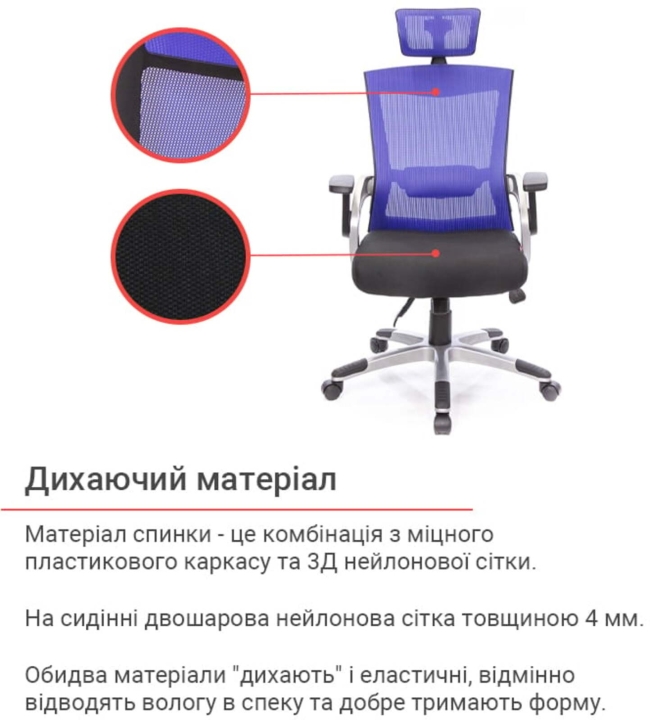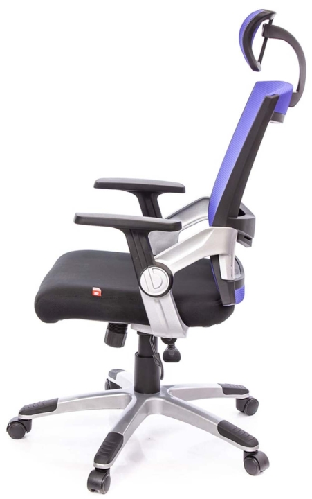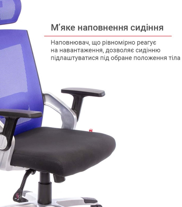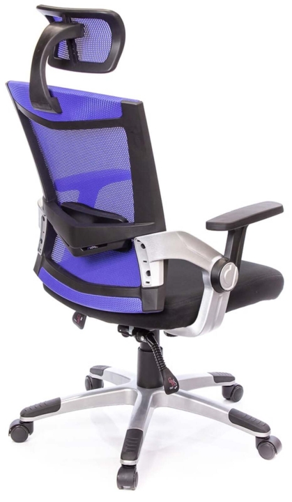Крісло АКЛАС Прима PL HR ANF (Чорний/Синій) - це креативне офісне крісло в урбаністичному стилі. Пальму першості в своєму сегменті воно отримало за нетривіальну зовнішність і високу якість, і тому гордо носить своє гучне ім'я. Ця незвичайна модель поєднує в собі цікавий дизайн в стилі Хай-Тек, легкість за рахунок сітчастої оббивки, високоякісні матеріали і надійні механізми. Наші покупці безсумнівно оцінять зручність і оригінальність Пріми - таке крісло просто не може залишитися без уваги. Воно буде доречно виглядати в сучасному офісі в стилі Open-Space або в мінімалістичній домашній обстановці. Дизайн. Відмінною рисою цієї моделі є дуже популярна сьогодні сітчаста оббивка та помітна зовнішність. Крісло виглядає так, немов зійшло з екрану фантастичного фільму про високотехнологічне майбутнє. Чіткі лінії силуету, мінімум декору і легкість - нічого зайвого, тільки максимум свободи та комфорту. Оригінальна спинка трапецієподібної форми має правильну ергономіку: невеликий поперековий вигин і легка бічна підтримка забезпечать комфортну опору спині. Додаткова підтримка хребта в області попереку здійснюється за рахунок м'якого валика, який кріпиться зовні, за сітчастої оббивкою. Оббивка. Оббивка крісла Прима - нейлонова сітка, натягнута на міцний пластиковий каркас, з якої ви будете комфортно себе відчувати навіть в самий спекотний день завдяки її "дихаючими" властивостями. Цей матеріал відмінно справляється з інтенсивним навантаженням і довго зберігає свої властивості та привабливий зовнішній вигляд, завдяки своїй еластичності, підвищеної повітропроникності, міцності і зносостійкості. Для сидіння використана більш щільна стільникова тканина, яка має ті ж властивості, що і сітка, але розрахована на більші навантаження. Механізми. Вбудований механізм гойдання підвищеної комфортності Аніфікс дає можливість влаштувати сеанс релаксу, не перериваючи важливий телефонний дзвінок або продовжуючи складати грандіозні плани підкорення бізнес-олімпу, а після - зайнятися поточними справами, зафіксувавши крісло в зручному положенні. Надійний газліфт дає можливість змінити висоту крісла з урахуванням вашого зросту. Підлокітники. Пластикові підлокітники у даній моделі - ексклюзивні. Вони складаються з 2 частин різного кольору. Рухома частина Т-подібної форми з чорного пластику має оригінальний дизайн кріплення і може змінювати кут нахилу. Робоча площина, на яку спираються руки, досить велика і має злегка шорстку текстуровану поверхню для того, щоб руки не зісковзували під час роботи.