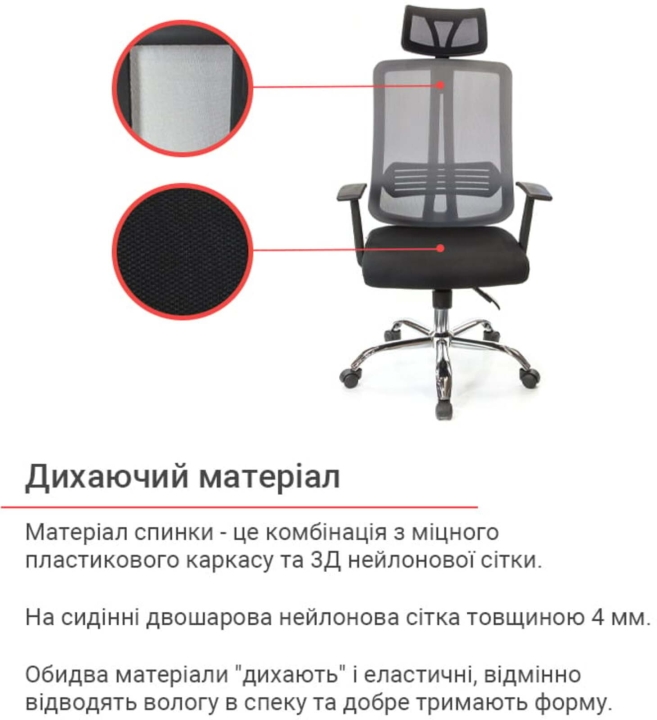 Оббивка. В якості оббивки сидіння використана нейлонова стільникова тканина завтовшки 4 мм. Спинка - з міцної нейлонової сітки, яка надає кріслу легкість і легкість. Обидва ці матеріали "дихаючі" і еластичні, прекрасно відводять вологу в спекотну погоду та відмінно тримають форму, а це просто незамінні якості для матеріалу офісного крісла, яке повинне витримувати великі навантаження в повсякденній експлуатації. За своєю структурою вони схожі, тільки тканина має додаткову підкладку, що збільшує її міцність і зносостійкість.