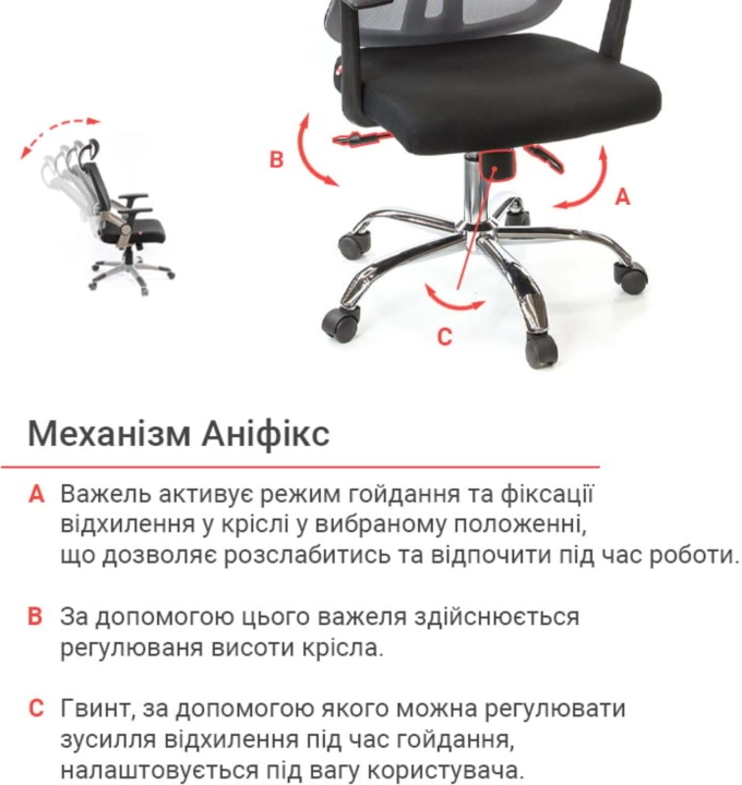 Механізми. Дане крісло оснащене механізмом гойдання Anifix, з фіксацією в будь-якому зручному положенні, який допоможе вам розбавити робочий день хвилинами приємного відпочинку, не відволікаючись від важливих справ. За допомогою газліфта є можливість налаштовувати висоту крісла під конкретні потреби. Завдяки декоративної ручці під сидінням, такий механізм легко налаштовується під вагу користувача, що дозволяє йому працювати виключно безпечно і правильно.