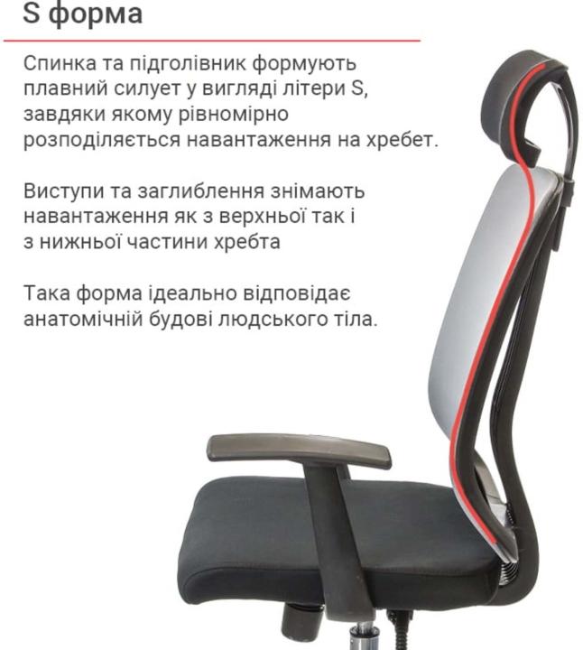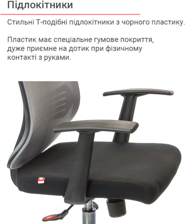 Підлокітники. У даній моделі стильні Т-подібні підлокітники з чорного пластику. Пластик має спеціальне гумове покриття, дуже приємне при фізичному контакті з руками.