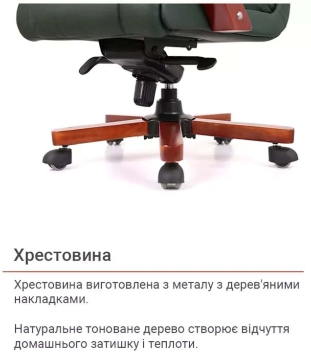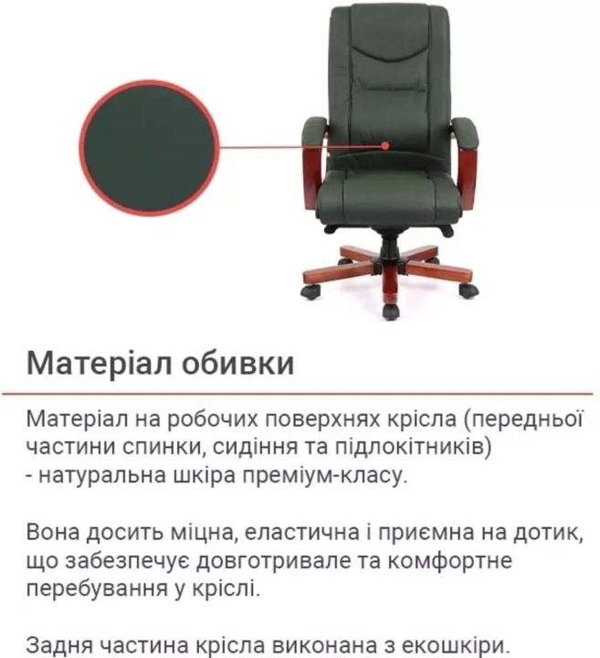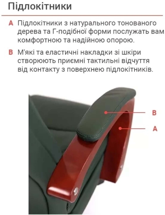Для пошива чехла на рабочих поверхностях используется натуральная кожа коровы, а именно на передней части спинки, сиденье и подлокотниках.На нерабочих поверхностях - экокожа, а именно искусственный материал на тканевой подкладке на боковых вставках, задней части спинки.Механизмы. Вдобавок комфортному сиденью кресло Артур оснащено механизмом мультиблок, с помощью которого вы сможете полноценно наслаждаться временем, проведенным в этом кресле, включив режим качания повышенной комфортности. Этот механизм также дает возможность выбрать и зафиксировать желаемое положение сиденья со спинкой и изменять его по своему усмотрению. Мультиблок легко настраивается под пользовательский вес с помощью декоративного винта под сиденьем, что позволяет ему отлично выполнять свою работу. Газлифт поможет вам отрегулировать высоту кресла под ваши предпочтения.Подлокотники. Г-образная форма и размер подлокотников подобраны таким образом, чтобы рукам было комфортно на них опираться. Натуральное тонированное дерево создает ощущение домашнего уюта и теплоты. Мягкие накладки защищают руки от контакта с холодной и жесткой поверхностью и дарят дополнительный комфорт. Красота дерева долгие годы будет радовать вас благодаря стойкому лаковому покрытию. Высота подлокотников в нижнем положении подобрана так, что кресло легко заходило под стандартный рабочий стол высотой от 75 см. Это позволяет значительно освободить окружающее пространство, в то время когда кресло не используется по назначению.Крестовина. Крестовина изготовлена из металла с деревянными накладками.