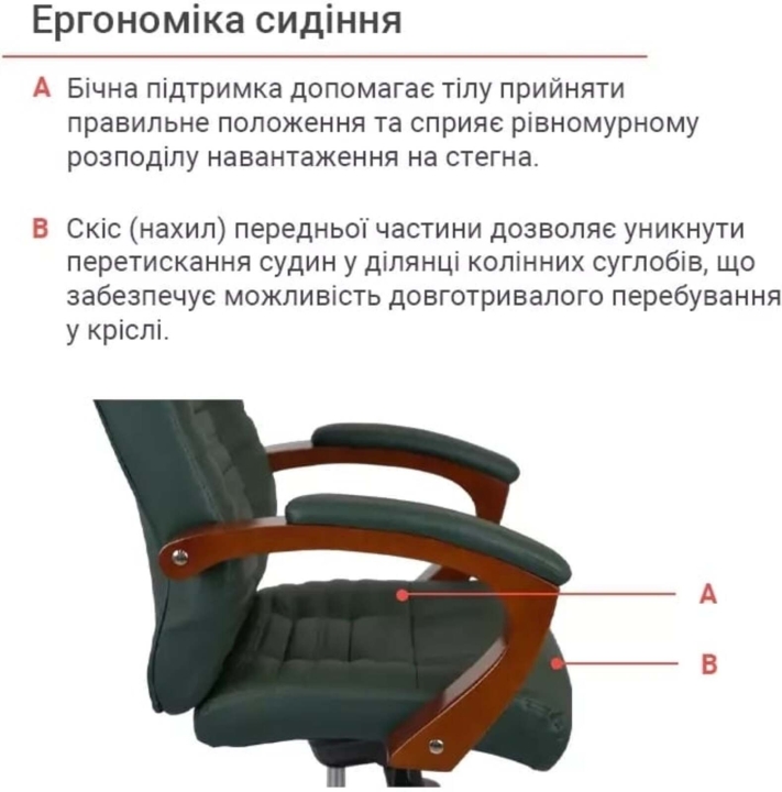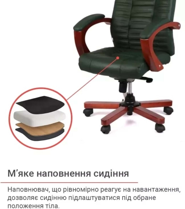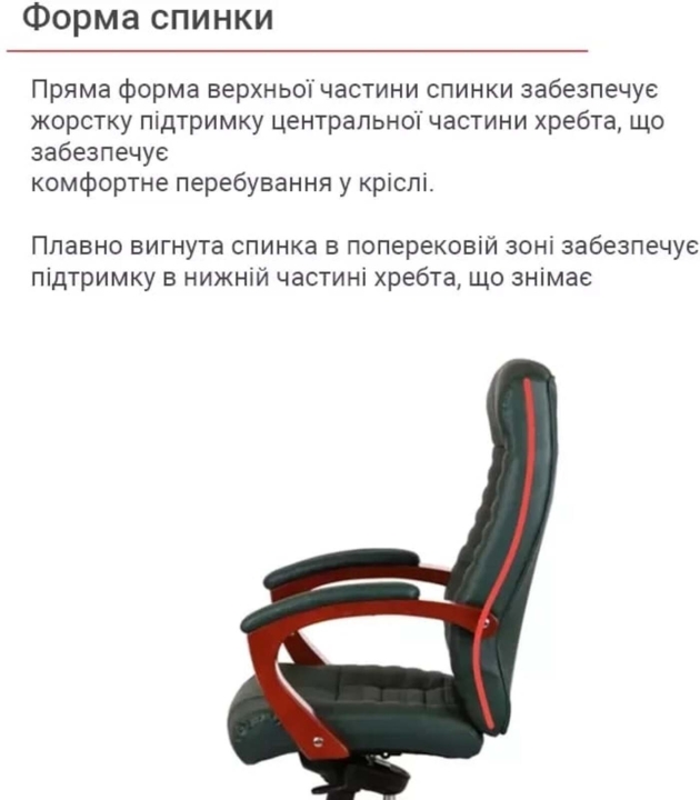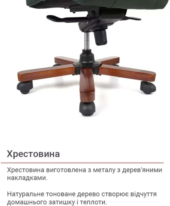 Підлокітники. Престижність даного крісла підкреслюють формені, широкі підлокітники. Їх Г-подібний вигин і розмір підібрані так, щоб рукам було комфортно спиратися на них. Натуральне тоноване дерево створює відчуття домашнього затишку і теплоти. М'які накладки захищають руки від контакту з твердою поверхнею і дарують додатковий комфорт.