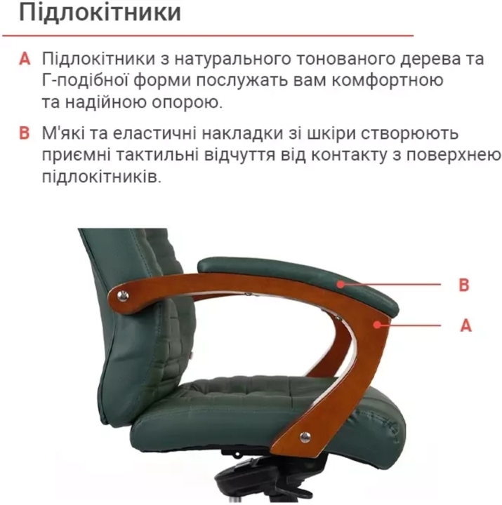 Подлокотники. Престижность данного кресла подчеркивают форменные, широкие подлокотники. Их Г-образный изгиб и размер подобраны так, чтобы рукам было удобно опираться на них. Натуральное тонированное дерево создает ощущение домашнего уюта и теплоты. Мягкие накладки защищают руки от контакта с жесткой поверхностью и дарят дополнительный комфорт.