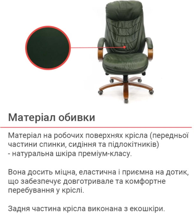 Для пошива чехла на рабочих поверхностях используется натуральная кожа коровы, а именно на передней части спинки, сиденье и подлокотниках.На нерабочих поверхностях - экокожа, а именно искусственный материал на тканевой подкладке на боковых вставках, задней части спинки.