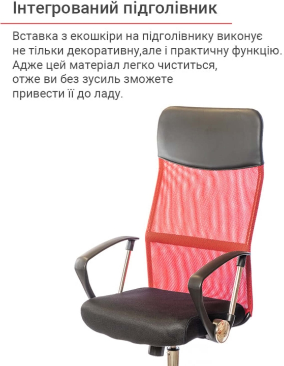 Сітчаста спинка легко пропускає повітря, а значить сидіти в такому кріслі дуже комфортно, особливо в спекотну погоду. Вставки з екокожі в районі поперекового вигину та підголівника виконують не тільки декоративну, але і практичну функцію. У цих місцях оббивка найчастіше брудниться та піддається додатковому навантаженню, а завдяки екошкірі, яка легко чиститься, ви без зусиль зможете привести її до ладу.