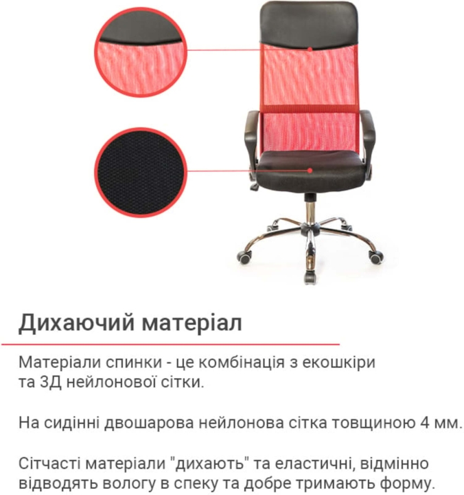 Дизайн. Елегантна комбінація двох матеріалів - сітки і екошкіри - це основний елемент дизайну даної моделі, який робить крісло стильним і повітряним.