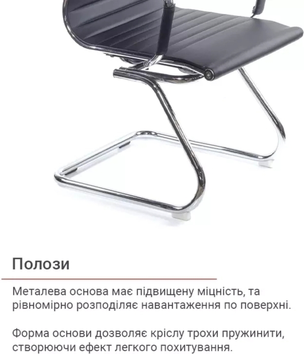 Основание. П-образное основание данной модели изготовлено из гнутой металлической трубы. Она крепкая, устойчивая и рассчитана на нагрузку до 100 кг. Блестящая полированная поверхность металла не боится царапин и сколов благодаря стойкому хромированному покрытию. Форма основания позволяет креслу немного пружинить, создавая эффект легкого покачивания. Для защиты напольного покрытия в кресле использованы пластиковые заглушки.