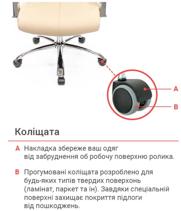 Крестовина. Прочная металлическая крестовина с хромированным покрытием рассчитана на большие нагрузки, привлекательно выглядит и отлично противостоит механическим повреждениям. Блестящее хромированное покрытие металла не только красивое, но и очень прочное. Стандартная комплектация роликовыми опорами для мягких напольных покрытий может быть изменена по желанию клиента. Для данной модели отлично подойдут ролики с хромированными накладками, которые гармонично сочетаются с металлическими деталями и дополняют общий образ модели.