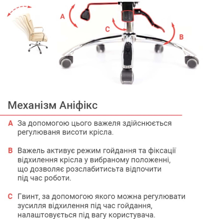 Механизмы. Встроенный механизм качания повышенной комфортности анификс даёт возможность устроить для себя любимого сеанс релакса, не прерывая важный телефонный звонок или продолжая составлять грандиозные планы покорения бизнес-олимпа. А после заняться текущими делами, зафиксировав кресло в удобном положении. Надёжный газо-масляный амортизатор позволяет изменить высоту кресла с учётом вашего роста.