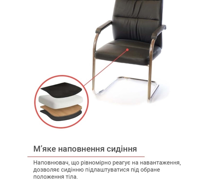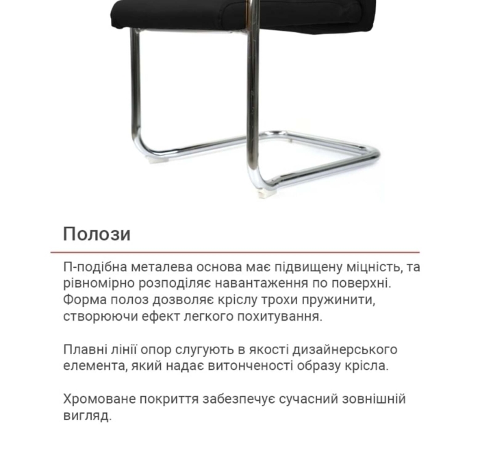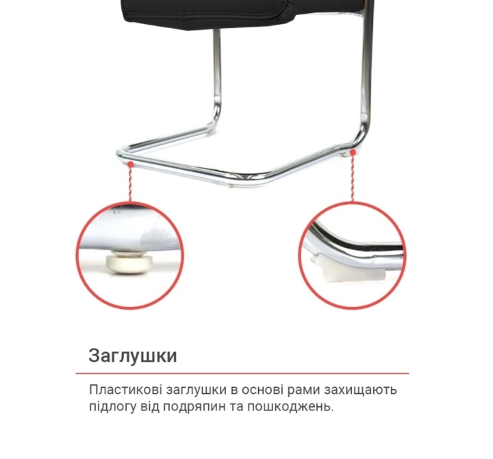 Основа. П-подібний каркас вигнутий з цільної металевої труби, його конструкція досить міцна і стійка. Хромовані елементи не втратять свою красу з часом, адже покриття дуже міцне і стійке до всіляких зовнішніх факторів. Форма основи дозволяє кріслу трохи пружинити, створюючи ефект легкого похитування. Пластикові заглушки в основі рами захищають підлогу від подряпин і пошкоджень.