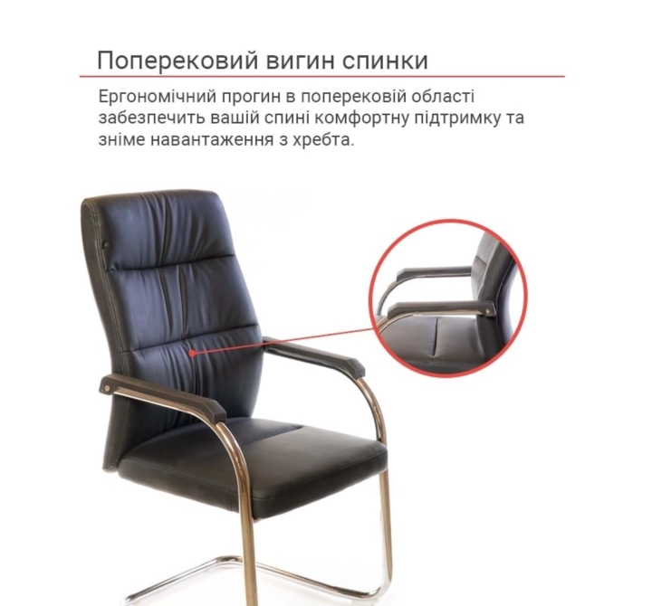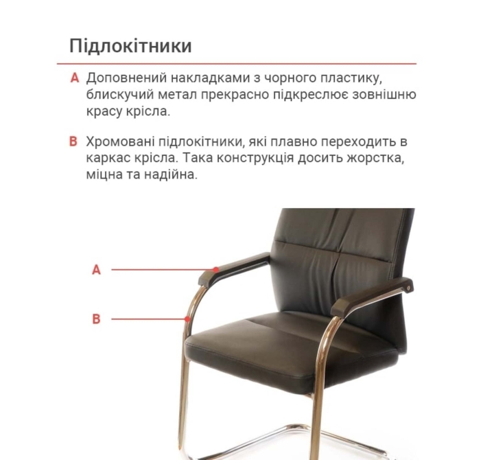 Підлокітники. Підлокітники виготовлені з хромованої труби, яка плавно переходить в каркас крісла. Така конструкція досить жорстка, міцна і надійна. Доповнений накладками з чорного пластику, блискучий метал прекрасно підкреслює зовнішню красу крісла. Хромоване покриття дуже стійке. Воно не дряпається, а значить надовго збереже красу крісла.