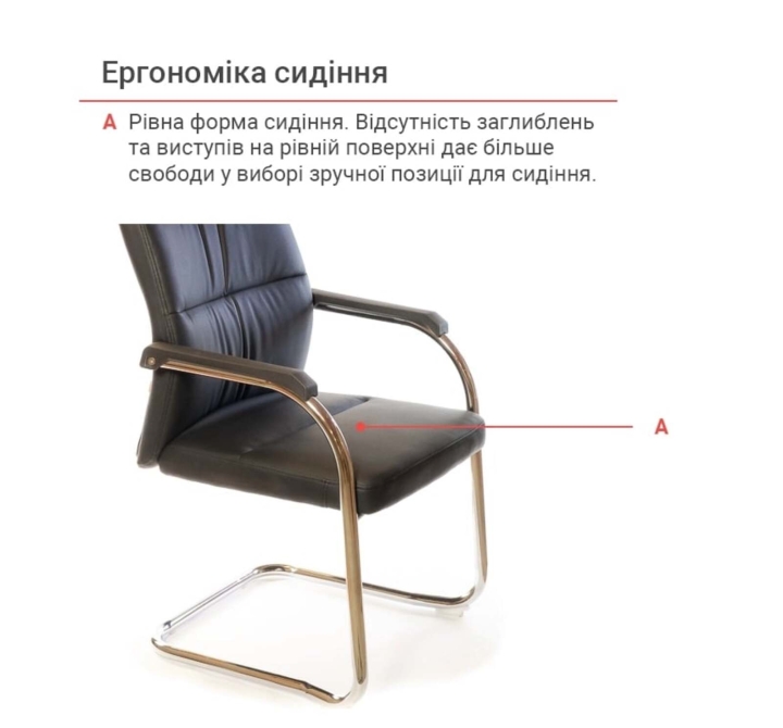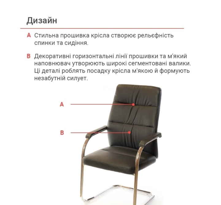 Дизайн. Стильна прошивка стільця формує неповторний рельєф спинки і сидіння - посидівши на цьому стільці всього кілька хвилин ви, безсумнівно, відчуєте і відзначите його комфортність. Декоративні горизонтальні лінії прошивки та м'який наповнювач формують широкі валики. Ці деталі не тільки роблять посадку крісла м'якою, але і формують пам'ятний силует, характерний саме для даної серії крісел. Хромовані елементи, підлокітники та основа, забезпечують моделі стійкість і міцність, а також надають їй сучасний і стильний вигляд.