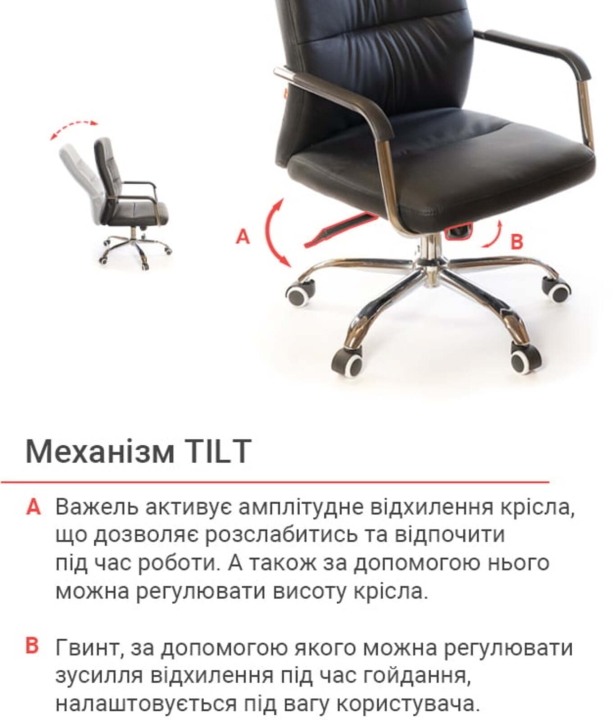 Механізми. Це комфортне крісло оснащене механізмом гойдання Titl. З ним ви зможете повноцінно насолоджуватися часом, проведеним в цьому кріслі. Включивши режим гойдання підвищеної комфортності, можна ненадовго розслабитися і відволіктися від повсякденної робочої метушні. Повернути крісло в статичний режим просто - зсунувши важіль на місце. За допомогою декоративної ручки під сидінням, такий механізм легко налаштовується під вагу користувача. Газліфт дозволить відрегулювати висоту крісла так, щоб ви влаштувалися в ньому з максимальним комфортом, налаштувавши його під свій зріст.