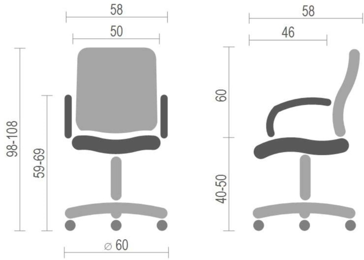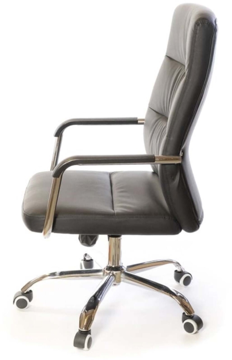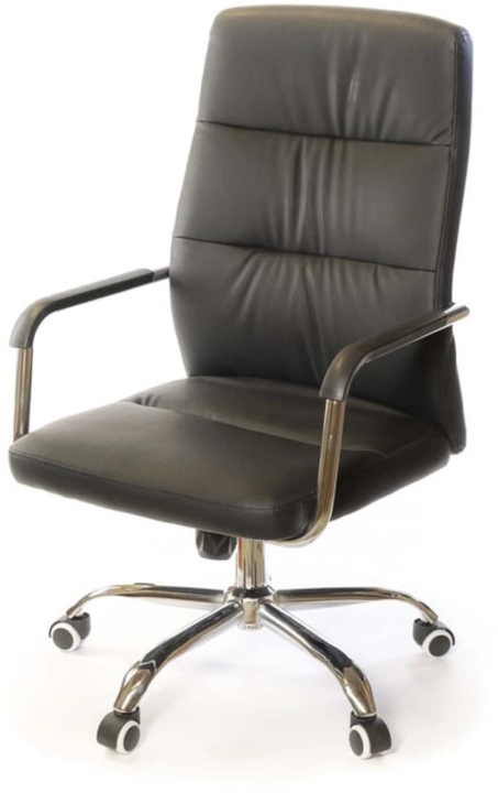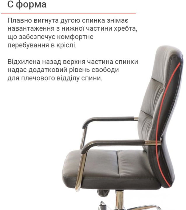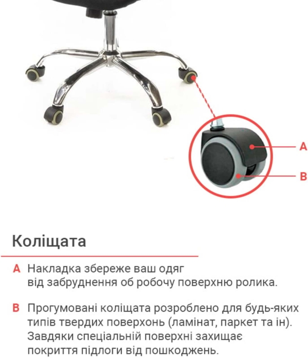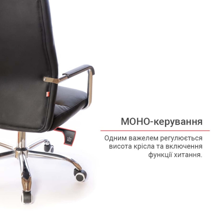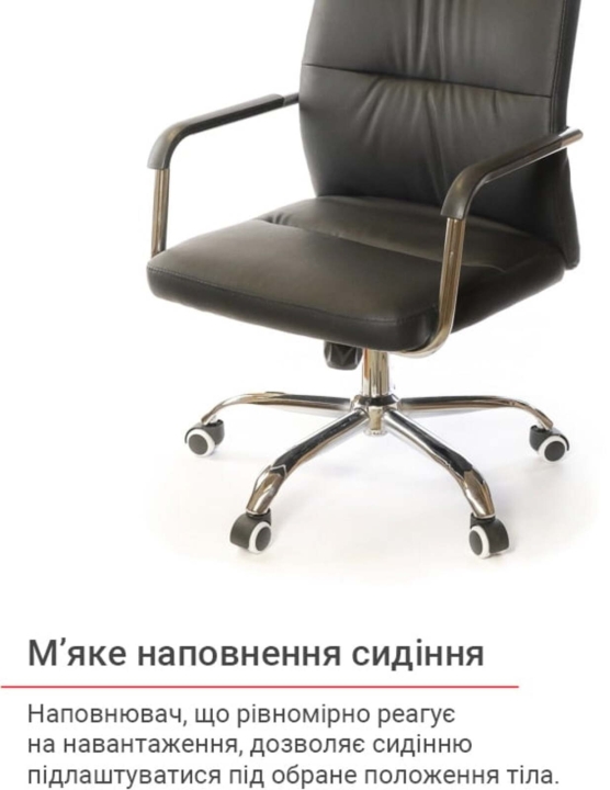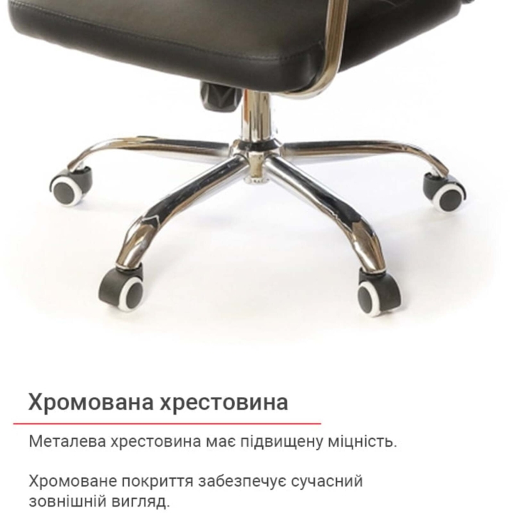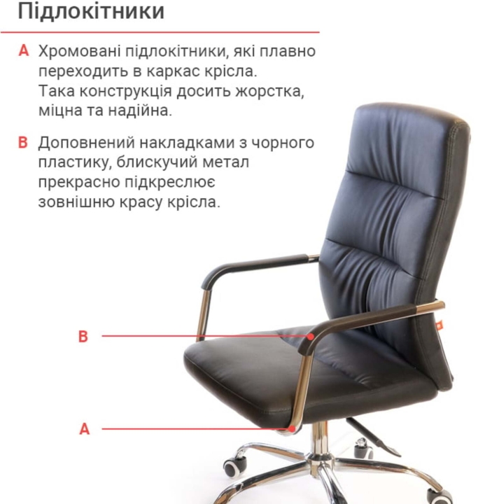 Підлокітники. Підлокітники виготовлені з хромованою труби, яка плавно переходить в каркас крісла. Така конструкція досить жорстка, міцна та надійна. Доповнений накладками з чорного пластику, блискучий метал прекрасно підкреслює зовнішню красу крісла. Хромоване покриття дуже стійке. Воно не дряпається, а значить надовго збереже красу крісла. Хрестовина. Металева хрестовина відмінно витримує навантаження до 120 кг. Промені хрестовини мають вигнуту форму, що формує елегантний силует крісла. Крісло легко пересувається завдяки роликовим опорам. Крісло оснащене універсальними прогумованими роликами, які підійдуть для всіх типів підлогових покриттів.
