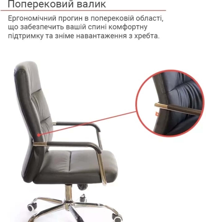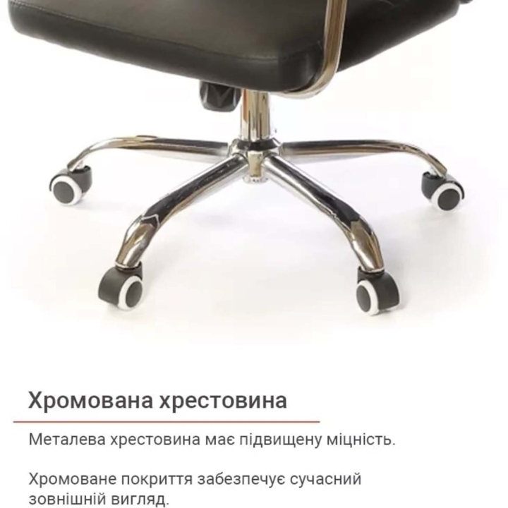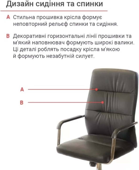Подлокотники. Подлокотники изготовлены из хромированной трубы, плавно переходящей в каркас кресла. Такая конструкция достаточно жесткая, крепкая и надежная. Дополненный накладками из черного пластика, блестящий металл прекрасно подчеркивает внешнюю красоту кресла. Хромированное покрытие очень стойкое. Оно не царапается, а значит надолго сохранит красоту кресла.