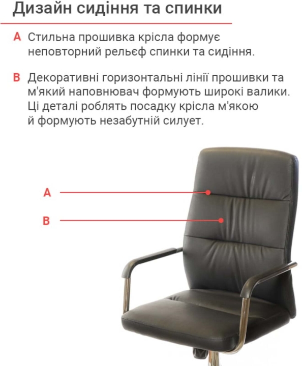 Дизайн. Стильна прошивка стільця формує неповторний рельєф спинки та сидіння - посидівши у цьому кріслі всього кілька хвилин ви, безсумнівно, відчуєте і відзначите його комфортність. Декоративні горизонтальні лінії прошивки та м'який наповнювач формують широкі валики. Ці деталі не тільки роблять посадку крісла м'якою, але й формують незабутній силует, характерний саме для даної серії крісел. Хромовані елементи - підлокітники й основа - забезпечують моделі стійкість і міцність, а також надають їй сучасного і стильного вигляду.
