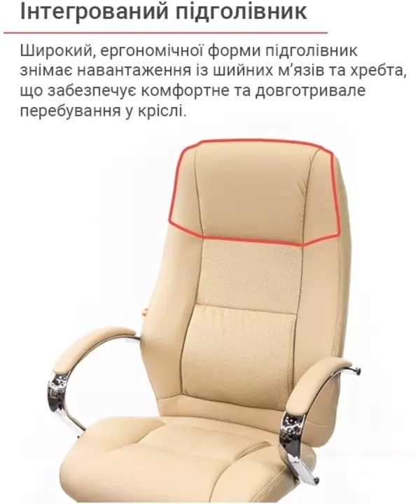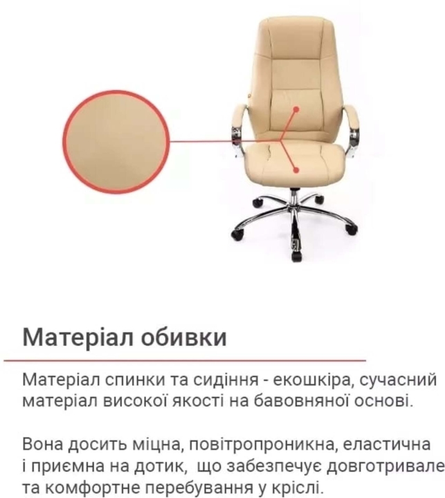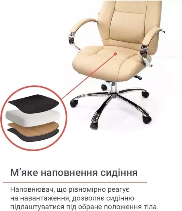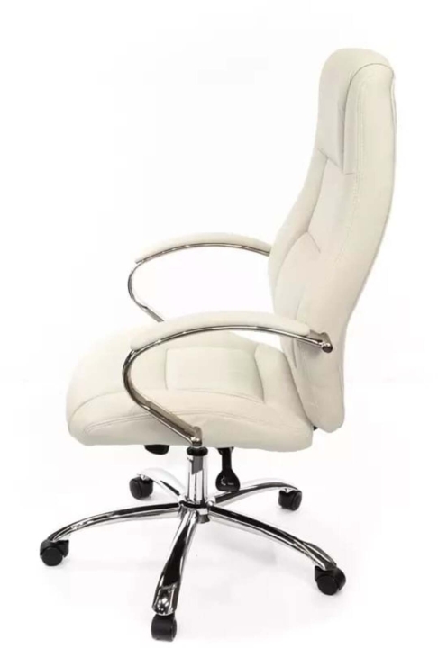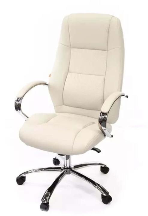 Дизайн. Элегантная классика - вот как можно охарактеризовать это кресло. Силуэт достаточно сдержанный, но благодаря удачному сочетанию линий прошивки, кожи и хромированного металла модель выглядит роскошно и уютно. Сидение и спинка украшены перетяжками прошивки, которые вместе с толстым слоем наполнителя формируют удобное посадочное место. Блестящие металлические детали гармонично обрамляют обивку и только подчеркивают красоту кресла. Светлая экокожа отлично дополнит интерьер женского кабинета или кабинет со светлым или черным деревом.