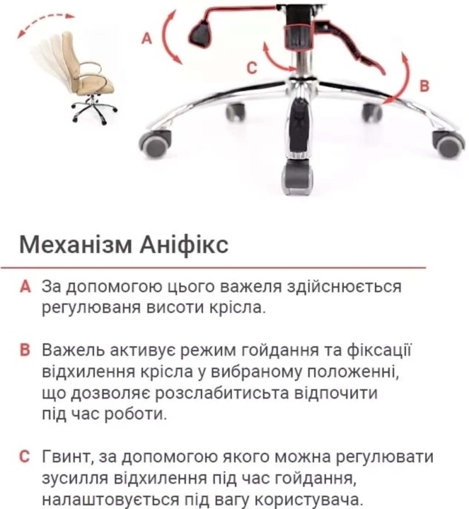 Механизмы. Данное кресло оснащено механизмом анификс. Это популярный механизм с возможностью фиксации в любом удобном положении, который поможет вам разнообразить рабочее время сеансом приятного отдыха, даже не прерывая важный телефонный звонок или продолжая составлять важный отчёт. Механизм достаточно просто отрегулировать под конкретный вес пользователя с помощью цилиндрической ручки под сидением. Газлифт поможет установить оптимальную для Вашего роста высоту сидения.