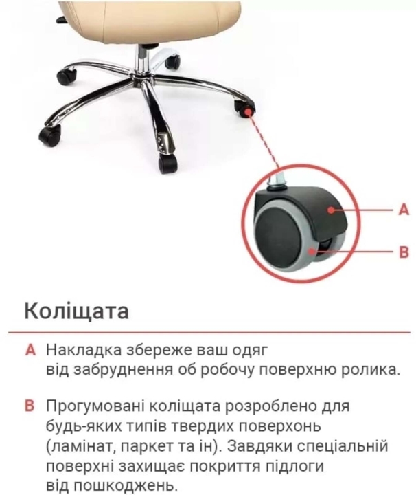 Крестовина. Крестовина у данного кресла из прочного хромированного металла. Благодаря этому ему обеспечена надёжность и устойчивость. При этом оно легко передвигается с помощью роликов. Хромированное покрытие очень стойкое, оно отлично защищает поверхность от мелких царапин и повреждений. Такая крестовина со временем не потеряет свой первоначальный внешний вид и будет долго радовать вас своим холодным блеском. Универсальные прорезиненные ролики, по-умолчанию установленные в кресле, подойдут для любого типа напольного покрытия. Также для данной модели подойдут ролики с хромированными накладками в стилистике кресла.