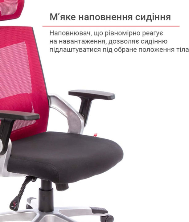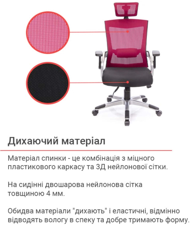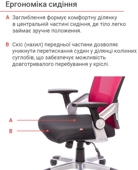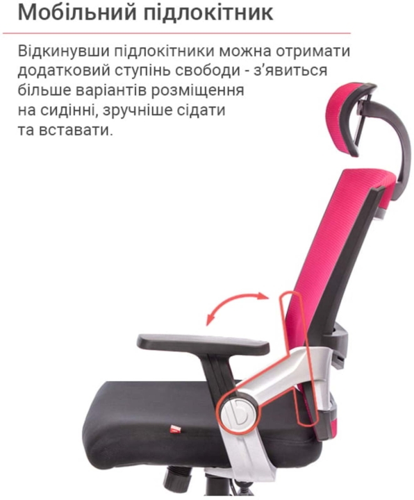 Підлокітники. Пластикові підлокітники у даній моделі - ексклюзивні. Вони складаються з 2 частин різного кольору. Рухома частина Т-подібної форми з чорного пластику має оригінальний дизайн кріплення і може змінювати кут нахилу. Робоча площина, на яку спираються руки, досить велика і має злегка шорстку текстуровану поверхню для того, щоб руки не зісковзували під час роботи.
