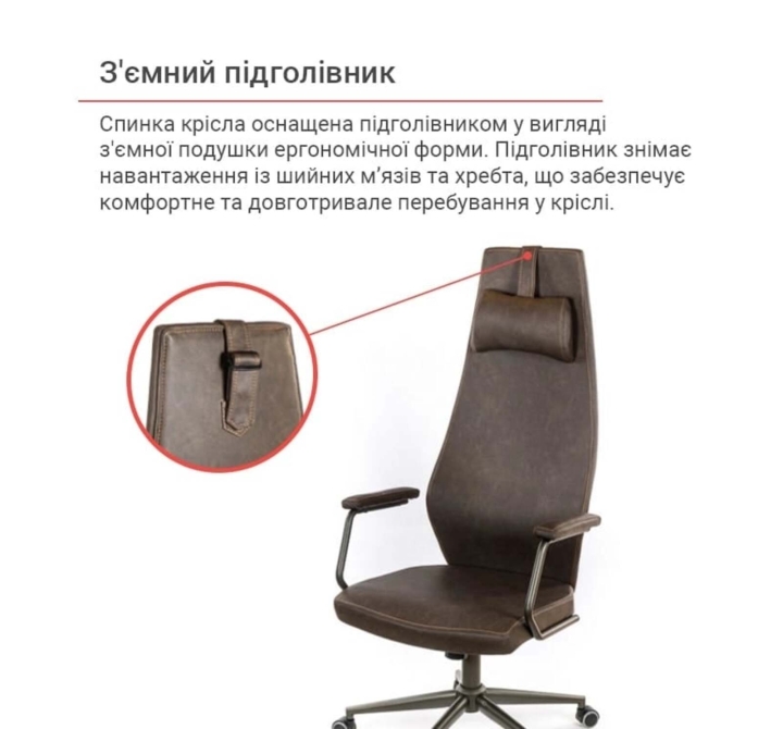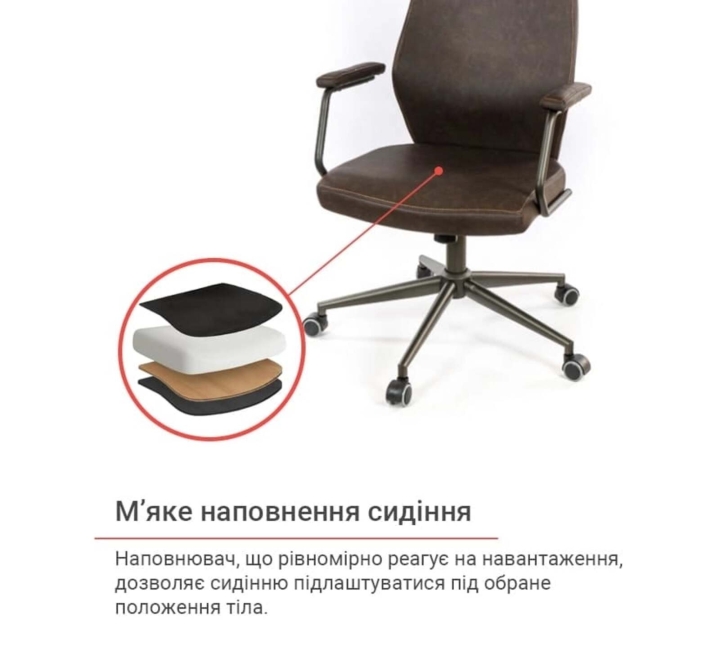 Підлокітники. Металеві підлокітники оснащені м'якими накладками, щоб захистити ваші руки від контакту з холодною поверхнею металу. Покриття металевих деталей крісла досить стійке, не дряпається і надовго зберігає привабливий зовнішній вигляд. Г-подібна форма і висота підлокітників дозволяє підсунути крісло впритул до робочого столу стандартної висоти та звільнити навколишній простір поруч.
